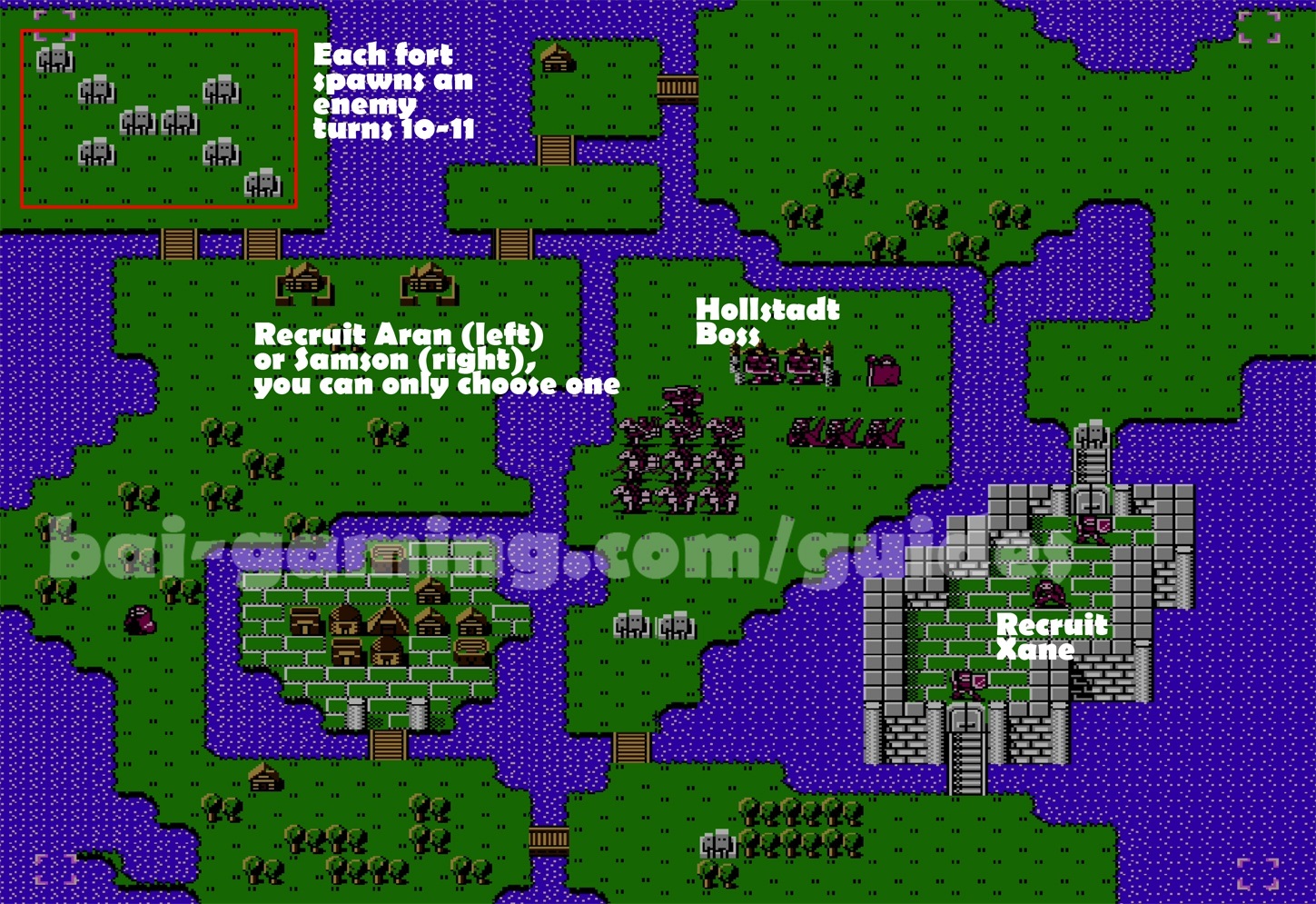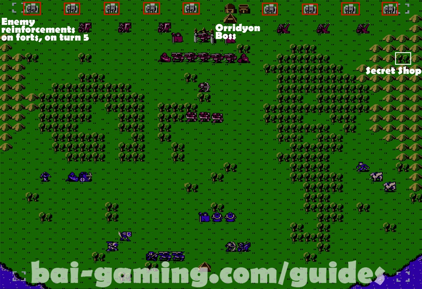 - No recruitment, Turn 5 has one turn of spawning enemies from the forts in the north
