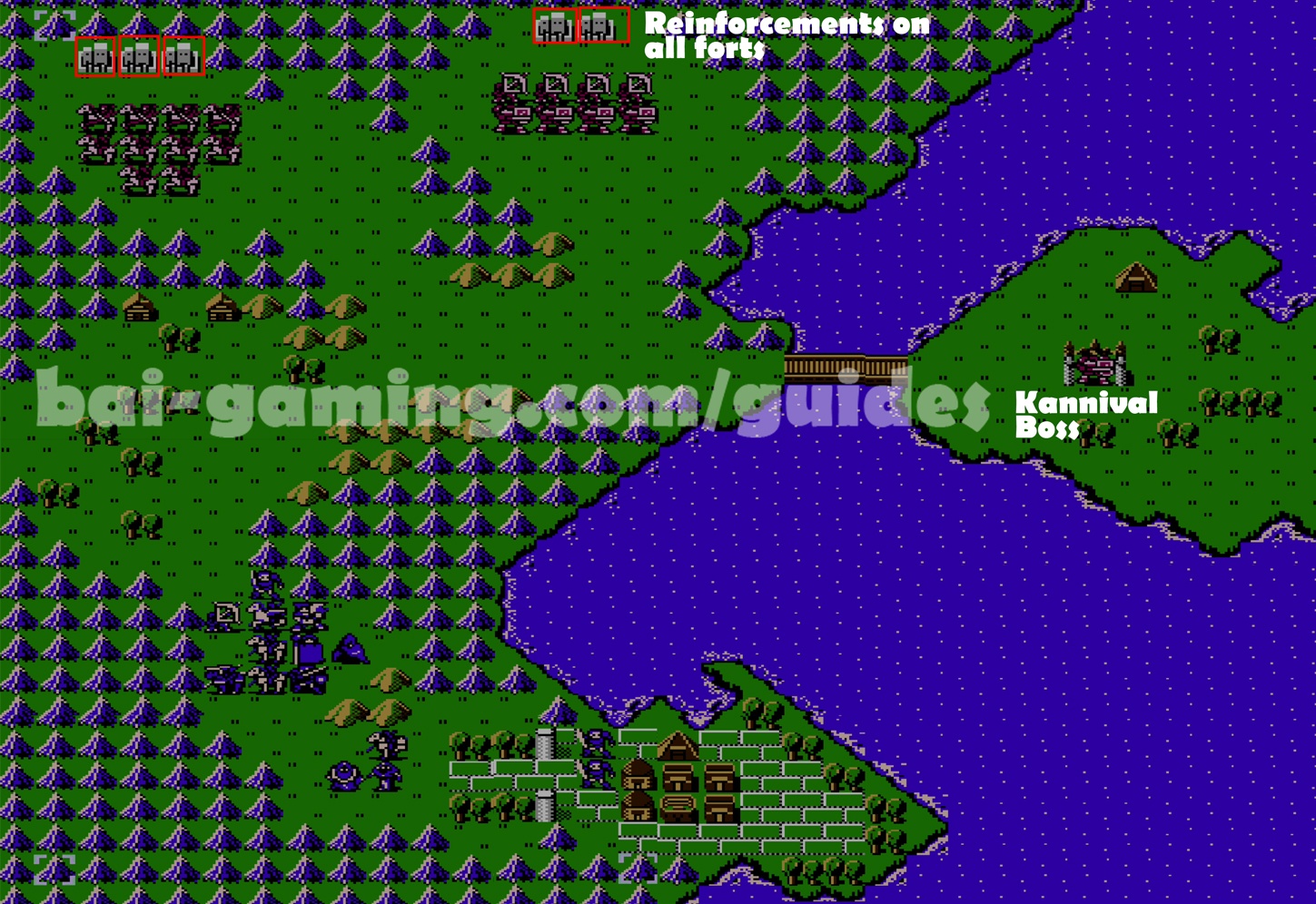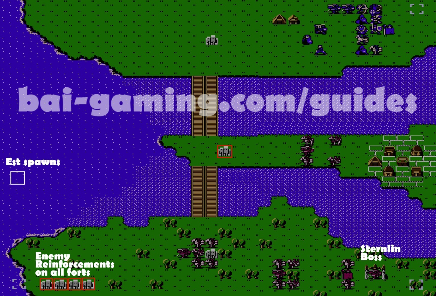 - Past the first bridge, defeat the eastern enemies, block the nearby fort, and make a wall by the end of the next bridge.