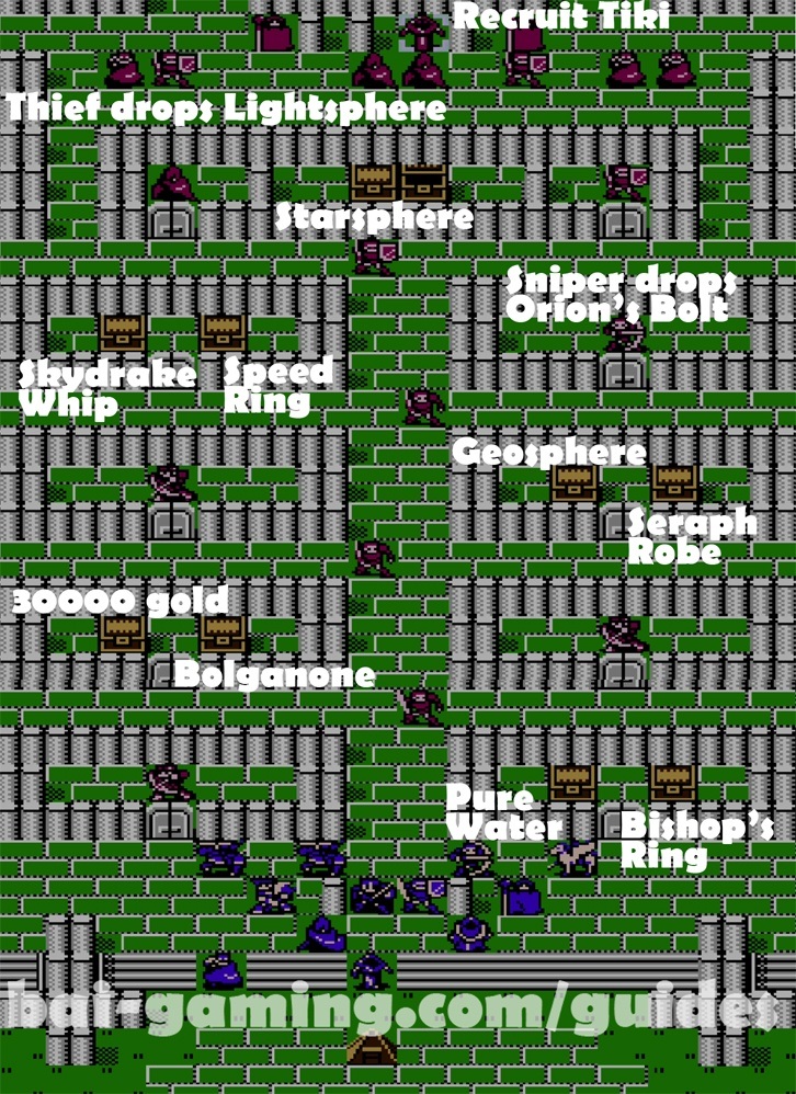 - Are you confused? Well, if you see the map, notice that one of the chests is already opened, this is the only time in the game where the thief drops an item, so make sure you defeat the thief with the devil sword, and he will drop the Lightsphere. He’s the one on the left, and be careful, he hits like a truck and as far as I know, the devil sword never hits him. At the same time, thieves don’t “run off” in this game, but make sure you get the Lightsphere from him.