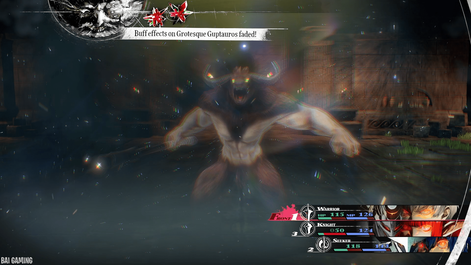 As long as you hit a weakness of his, on Enemy Turn 4 you’ll get a message “Buff effects on Grotesque Guptauros faded!” meaning his powerful attack was cancelled successfully because you struck his weakness. He will still use his second press turn to attack so make sure you can handle a regular attack from him but it’s a regular weak attack on one party member.