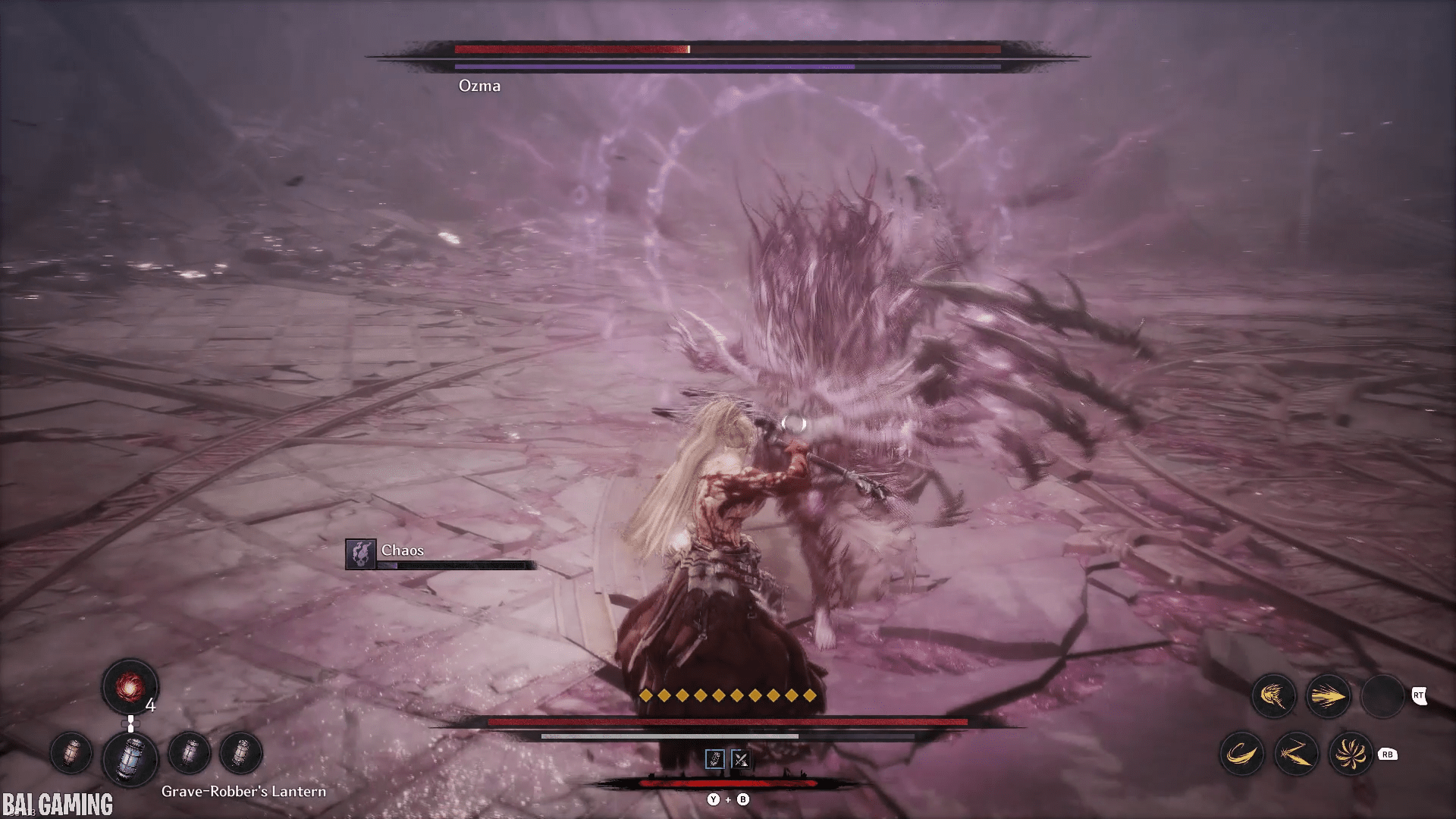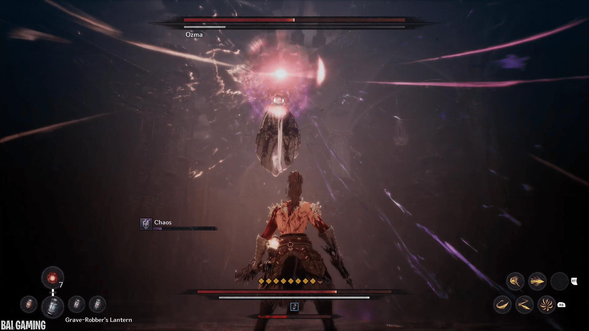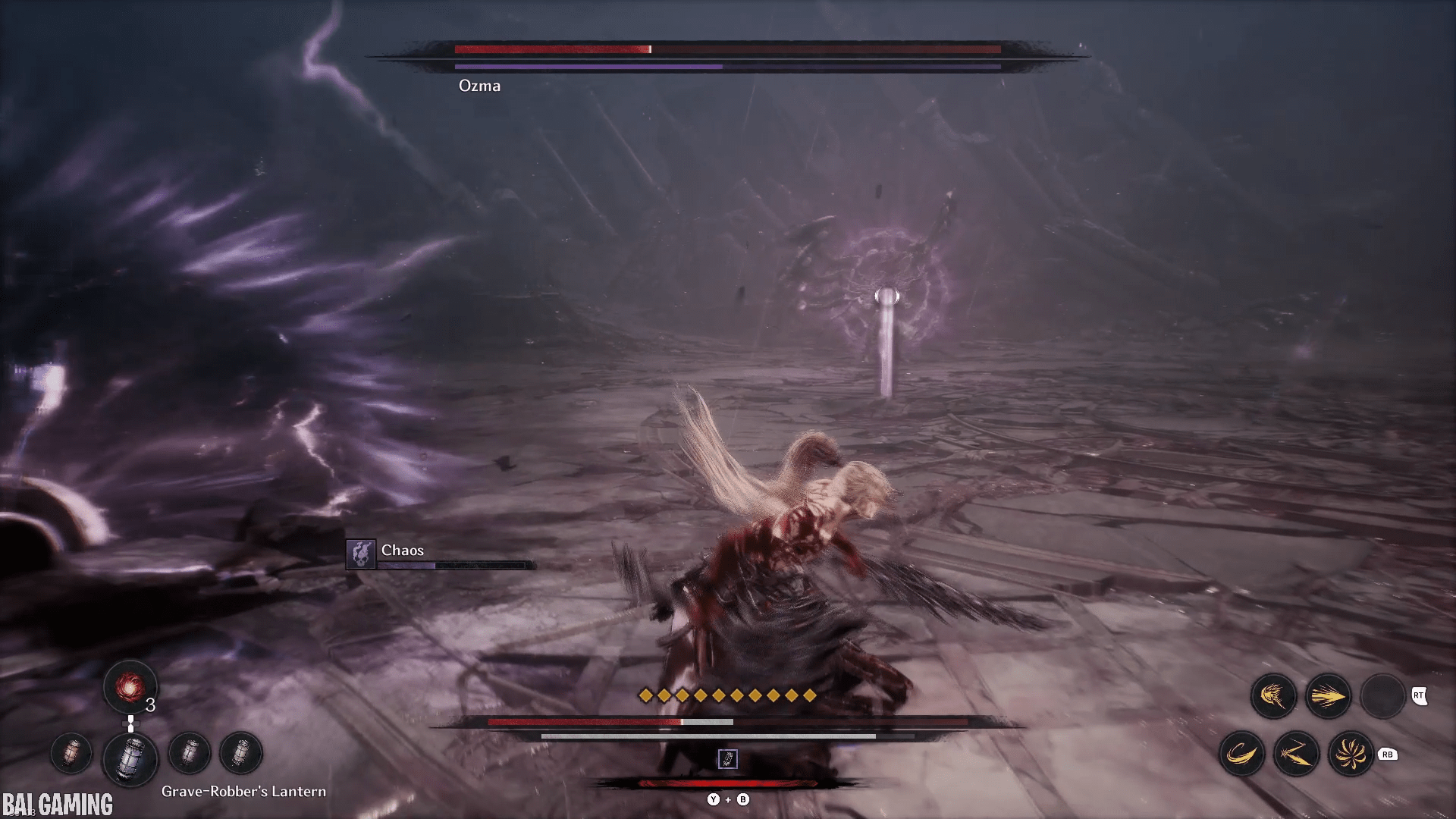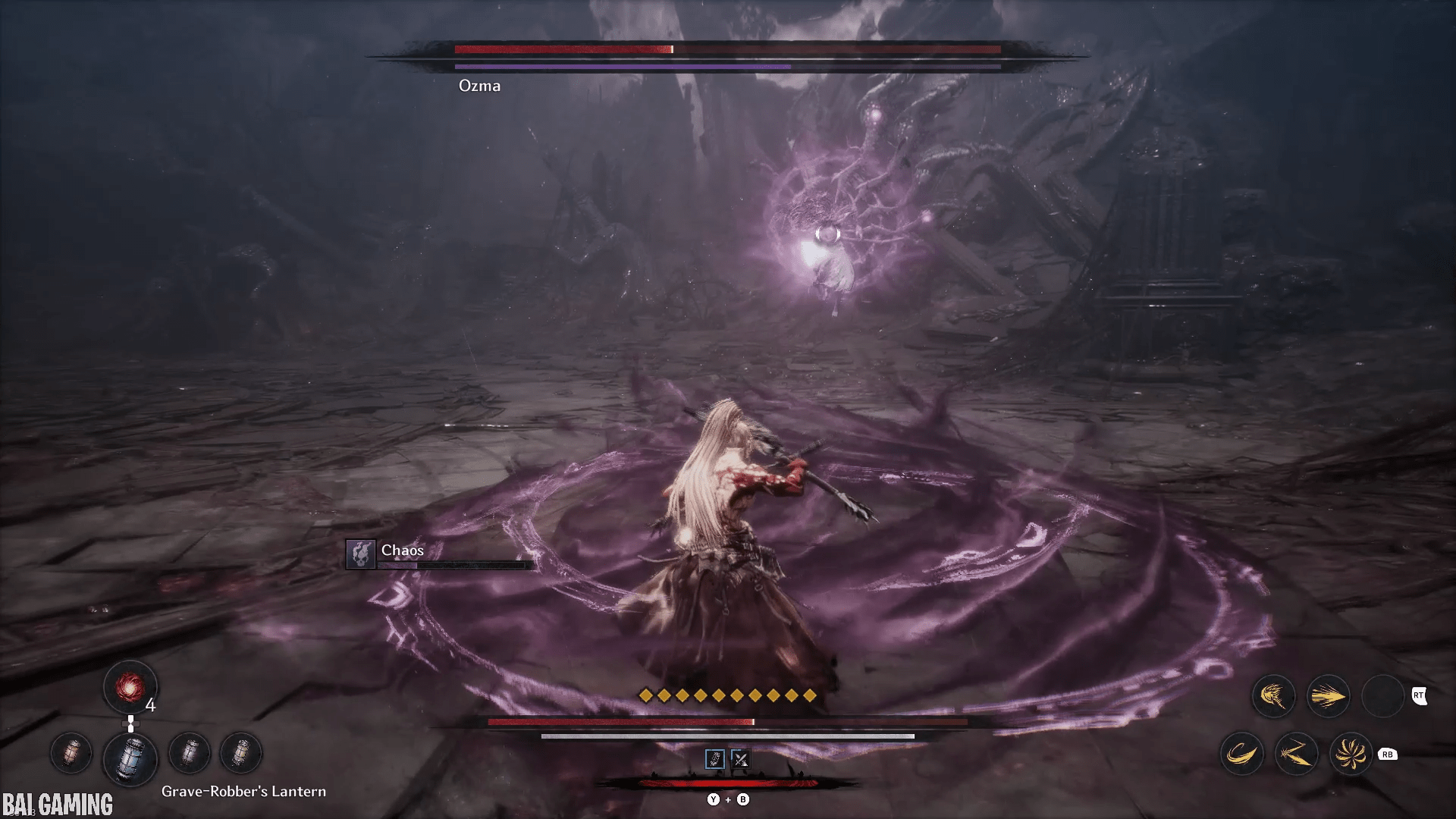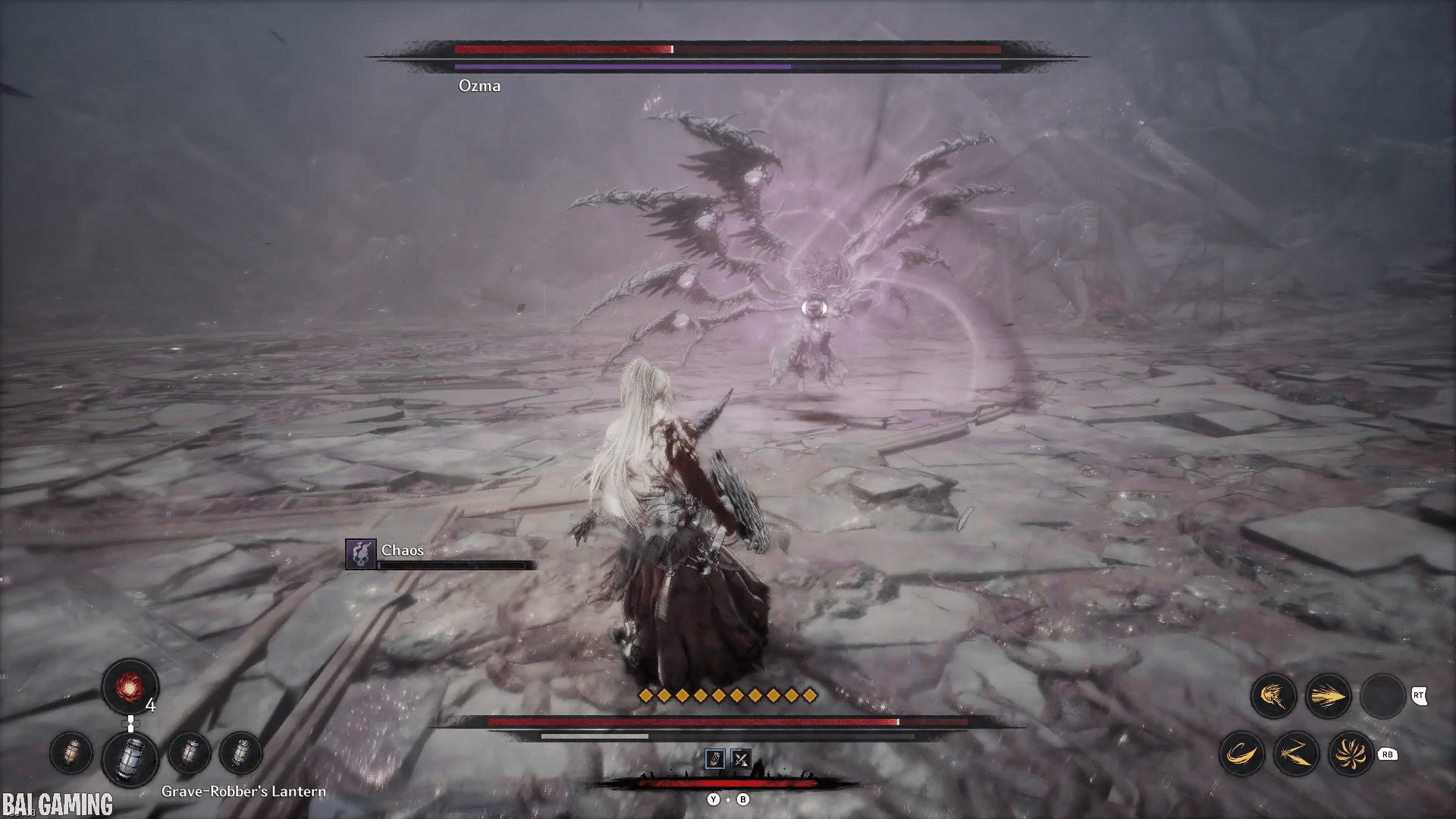 The last part of this move will have him shoot out vertical slices of chaos that head towards you. This is fast and hard to dodge. I recommend holding block (L1/LB) to make your movement slower. Then carefully try to find a gap in the waves to walk into and the slices will pass through you no problem. The timing is tight and if you’re backed into a wall you might not have space to move.