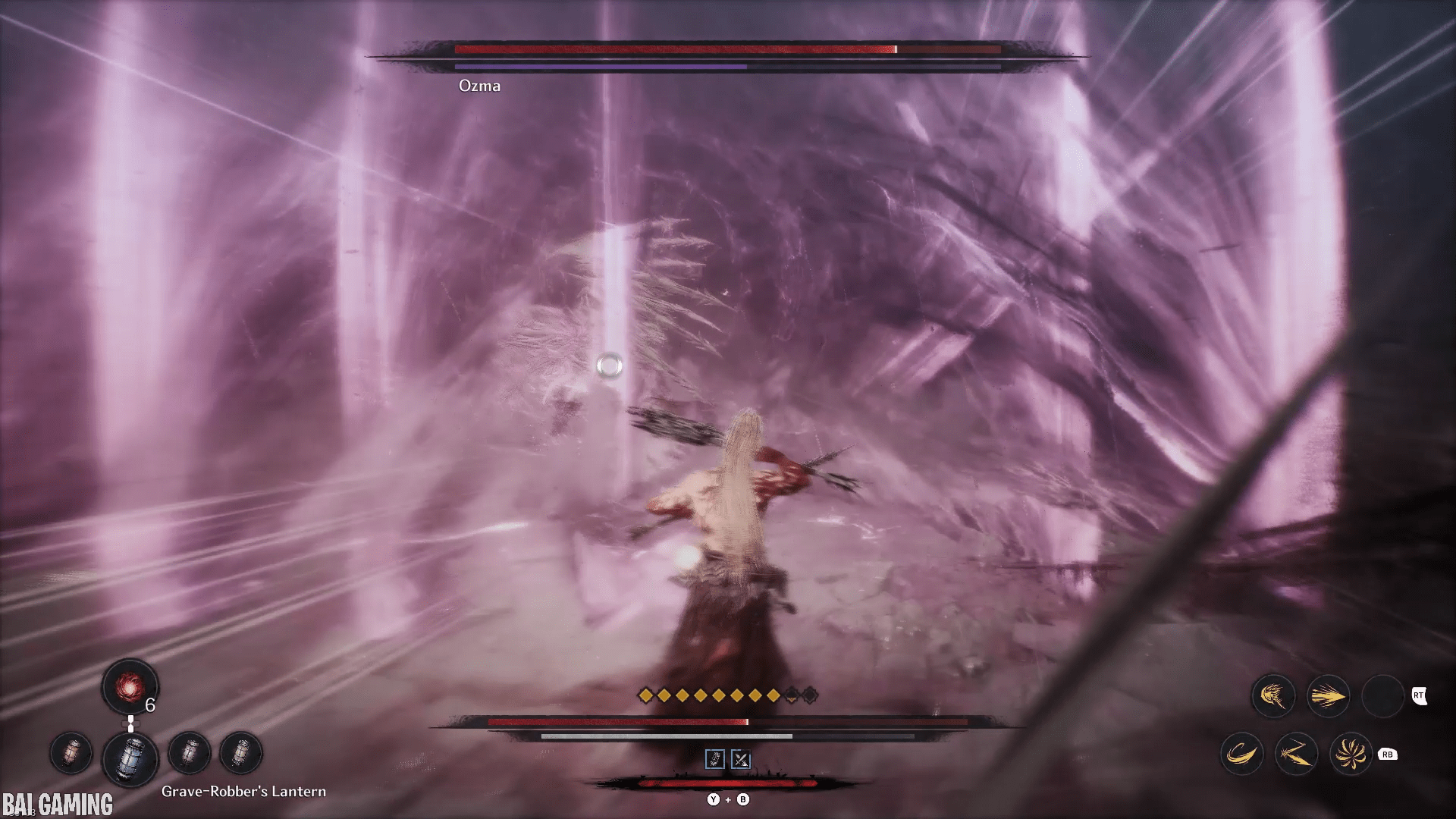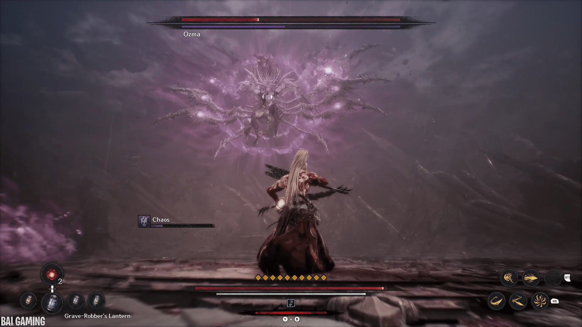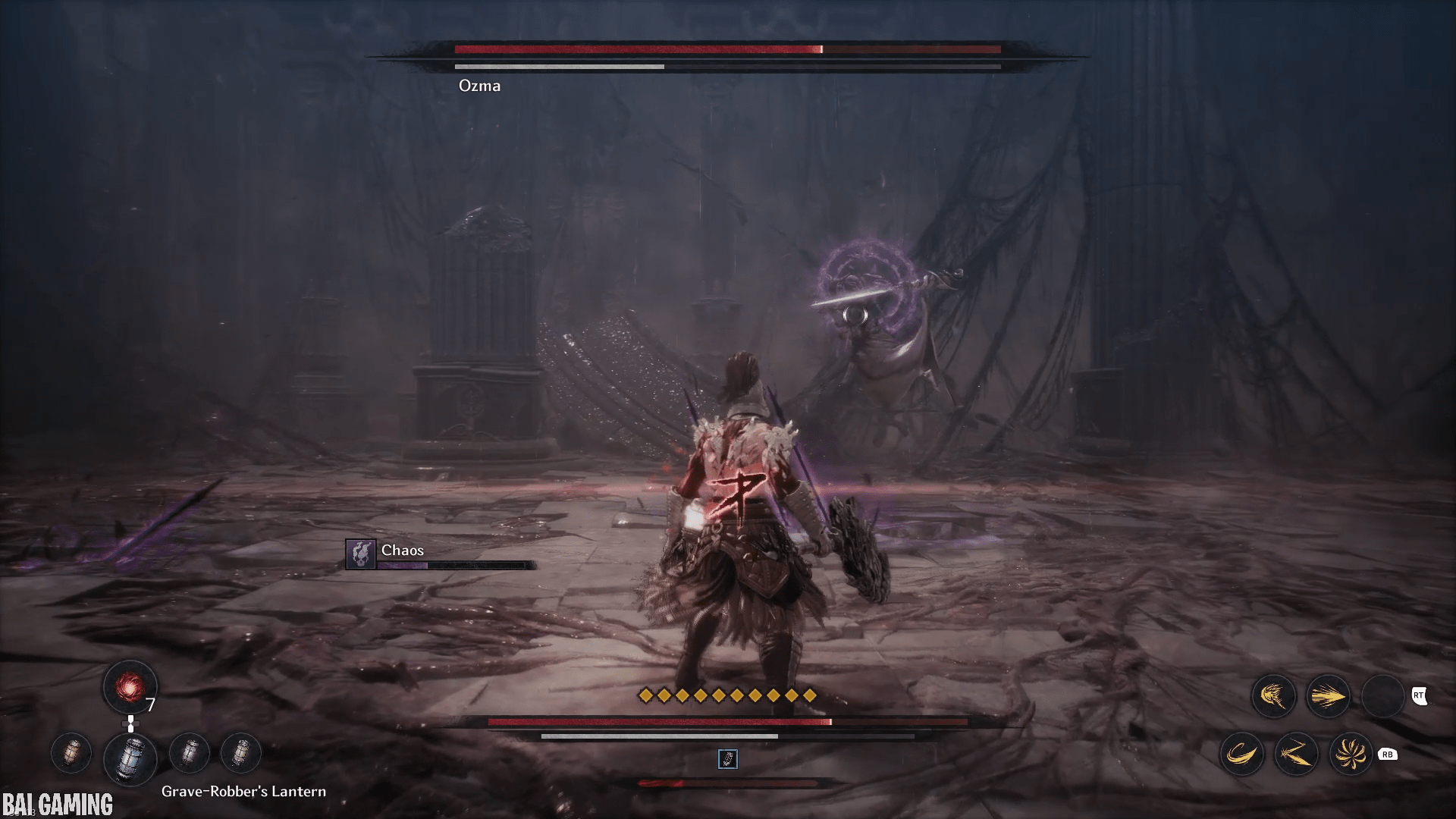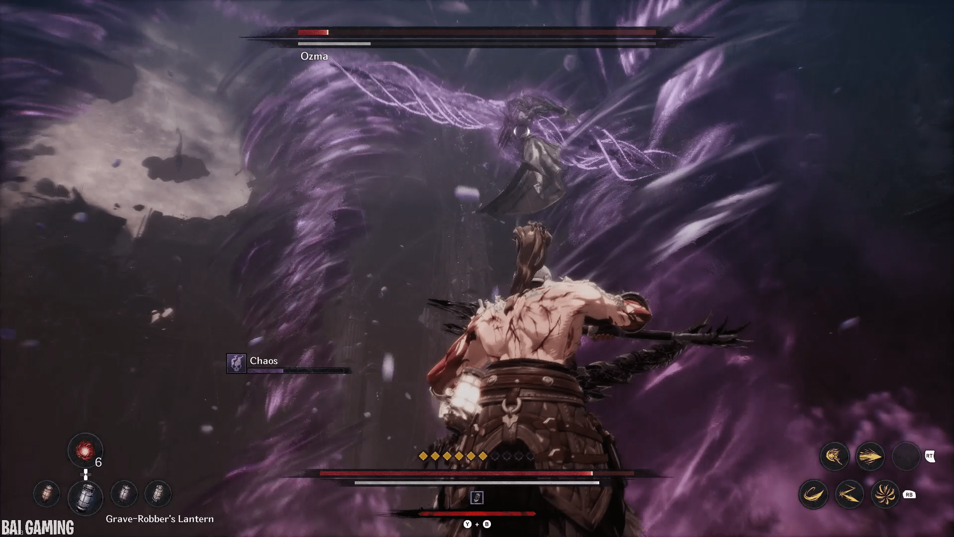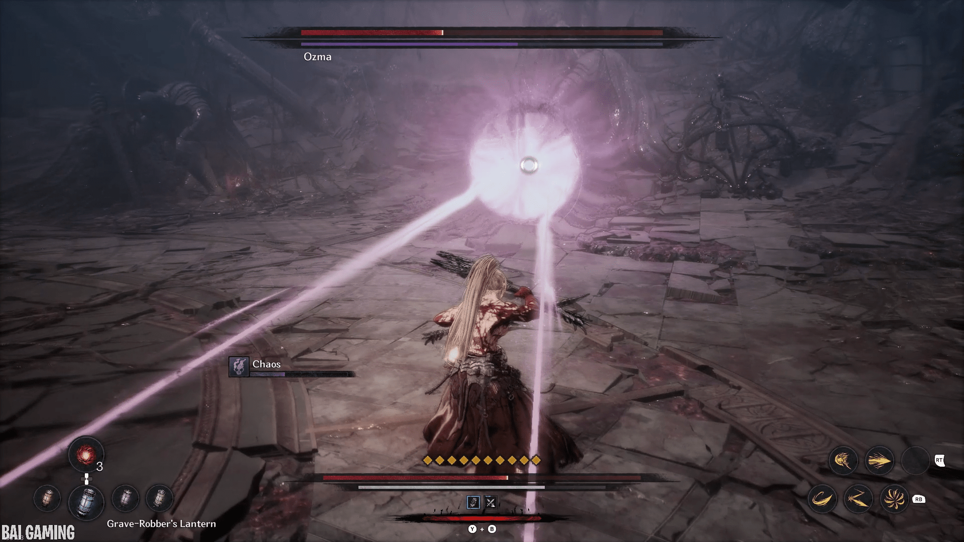 The last part of this move will have him shoot out vertical slices of chaos that head towards you. This is fast and hard to dodge. I recommend holding block (L1/LB) to make your movement slower. Then carefully try to find a gap in the waves to walk into and the slices will pass through you no problem. The timing is tight and if you’re backed into a wall you might not have space to move.