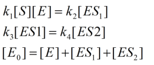 Here, [E\(_0\)] represents the initial concentration of the enzyme, [S] represents concentration of the substrate, and [ES\(_1\)], [ES\(_2\)] represent concentrations of the enzyme-substrate complexes.