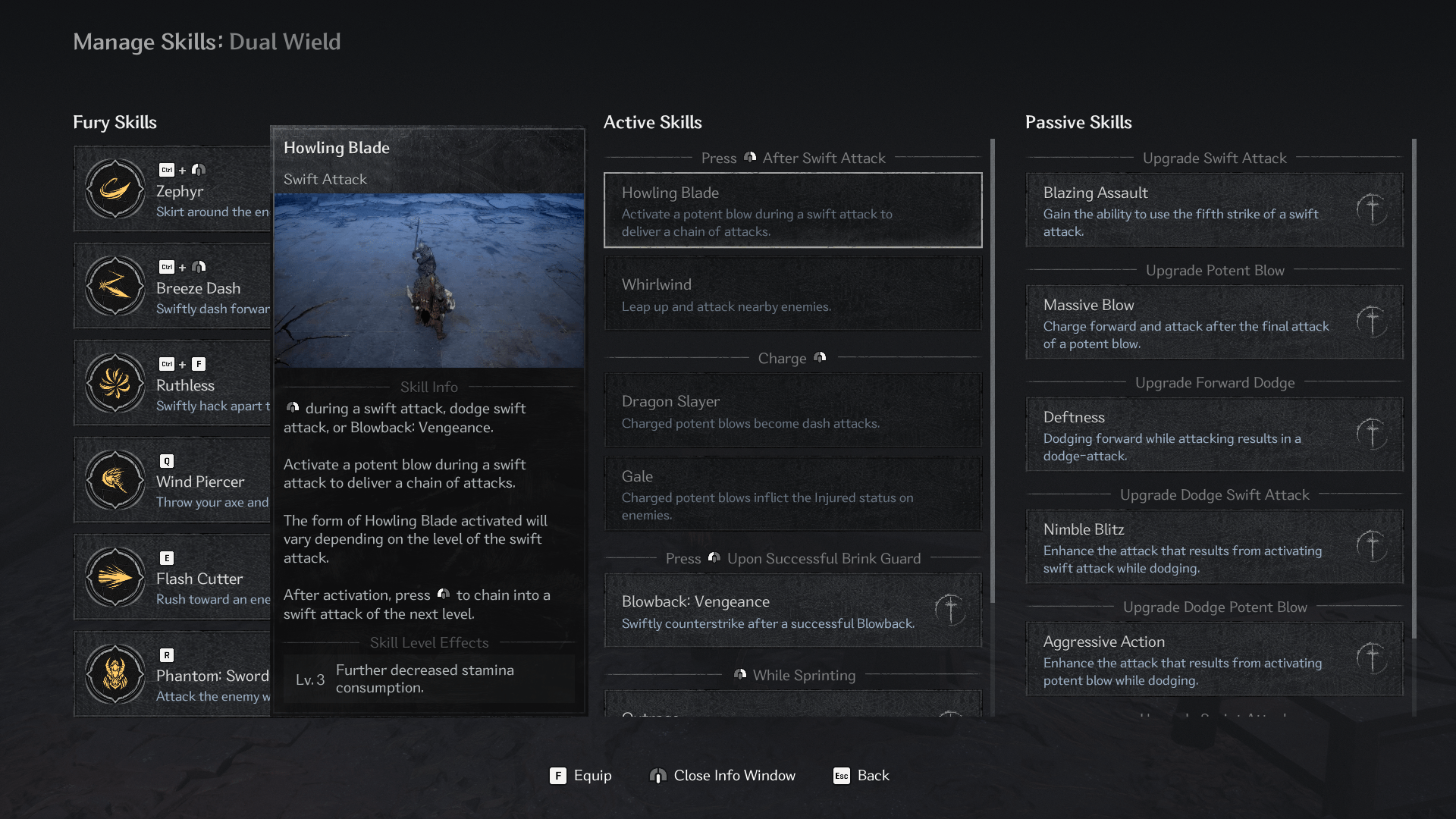 - Use this screen to read all terms for your build. For instance, if an equipment says it increases your “Blowback: Vengeance” damage by 5%, then read this screen to find out that it’s when you attack after doing a perfect block (dual wield build).